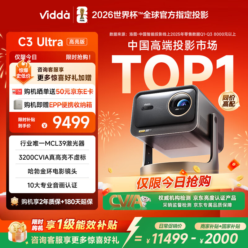 Vidda C3 Pro高亮版 海信4K超高清三色激光变焦投影仪家用投影机 3100CVIA+128GB存储 家庭影院国家补贴