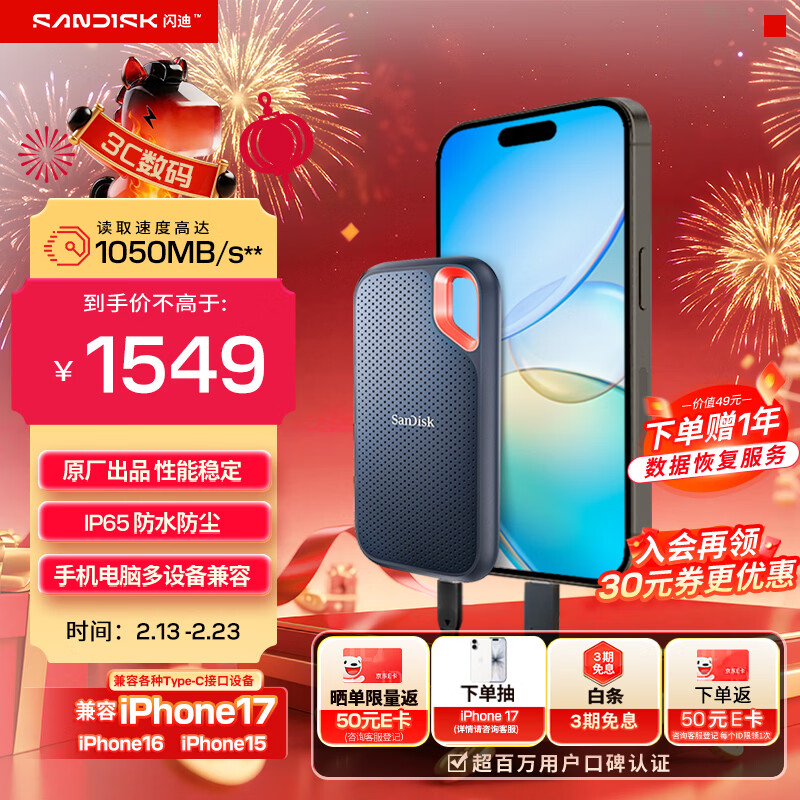 闪迪(SanDisk)1TB Type-c USB3.2 NVMe移动固态硬盘(PSSD)E61卓越版 1050MB/s三防保护 手机笔记本电脑外接SSD
