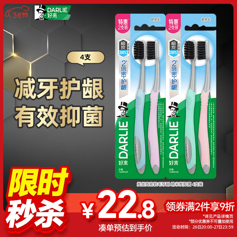 DARLIE好来(原黑人)炭丝高密软毛牙刷 纳米炭抑菌 4支装 便携装