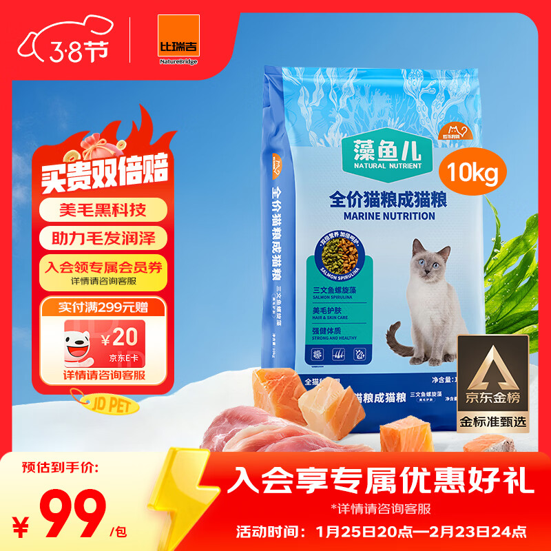 比瑞吉猫粮爱不将就藻鱼儿全价成猫粮10KG 含三文鱼螺旋藻原料透明