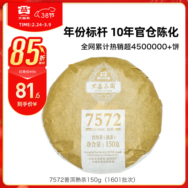 大益茶叶 普洱茶熟茶 7572经典标杆茶 茶叶自饮 口粮熟茶 10年陈标杆150g(1601批次)