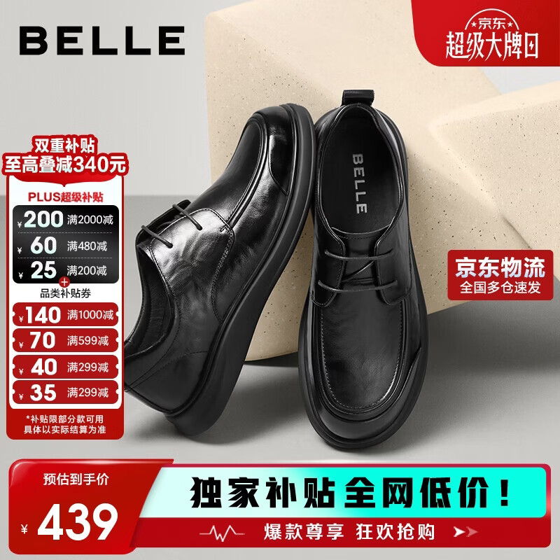 百丽男鞋质感商务休闲皮鞋26春夏牛皮舒适通勤鞋 黑色-系带 40