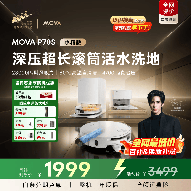 MovaP70S活水滚筒扫地机器人扫拖洗烘一体自清洁洗地机器人热水洗拖布水箱版P70S【宋威龙同款】