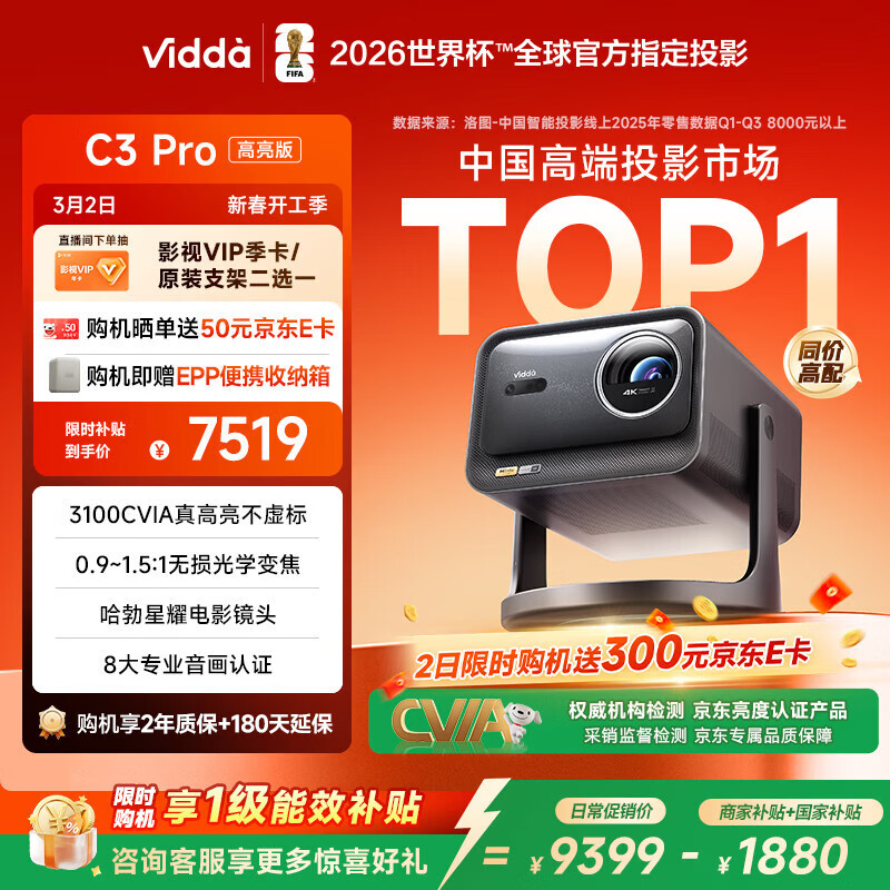 Vidda C3 Pro高亮版 海信4K超高清三色激光变焦投影仪家用投影机 3100CVIA+128GB存储 家庭影院国家补贴