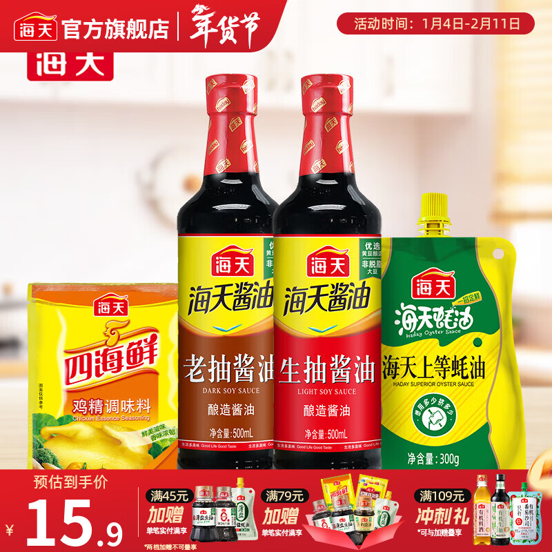海天酱油 经典老抽生抽500mL 炒菜烹饪炖肉提鲜上色家用酿造酱油pet瓶 生抽+老抽+蚝油300g+鸡精40g