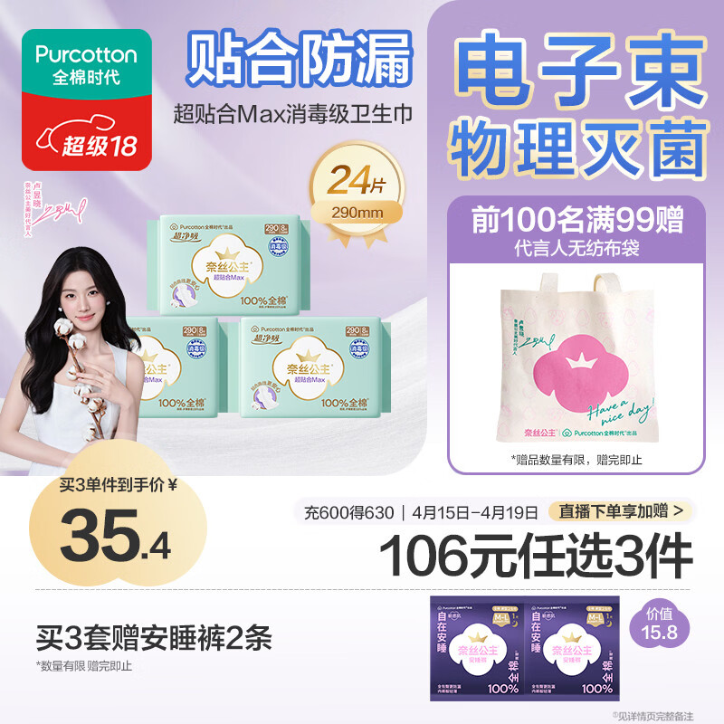全棉时代【卢昱晓推荐】奈丝公主超净吸超贴合MAX消毒级卫生巾290mm*24p