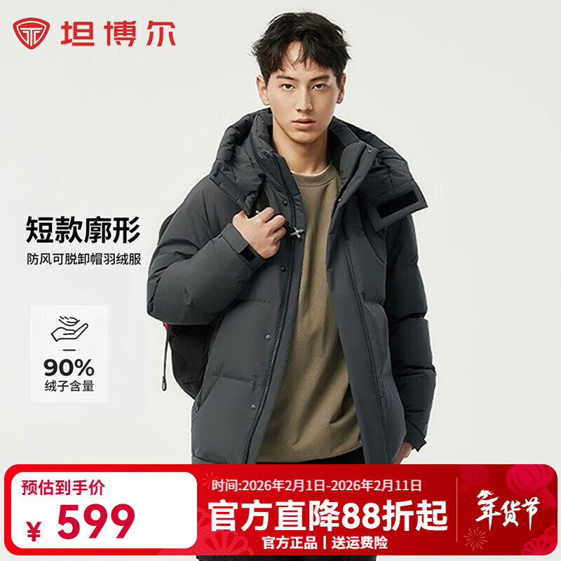 坦博尔(Tanboer)2025新款防风可脱卸帽羽绒服男短款户外休闲秋冬厚外套 青砂石 M (170) 建议体重125斤以内