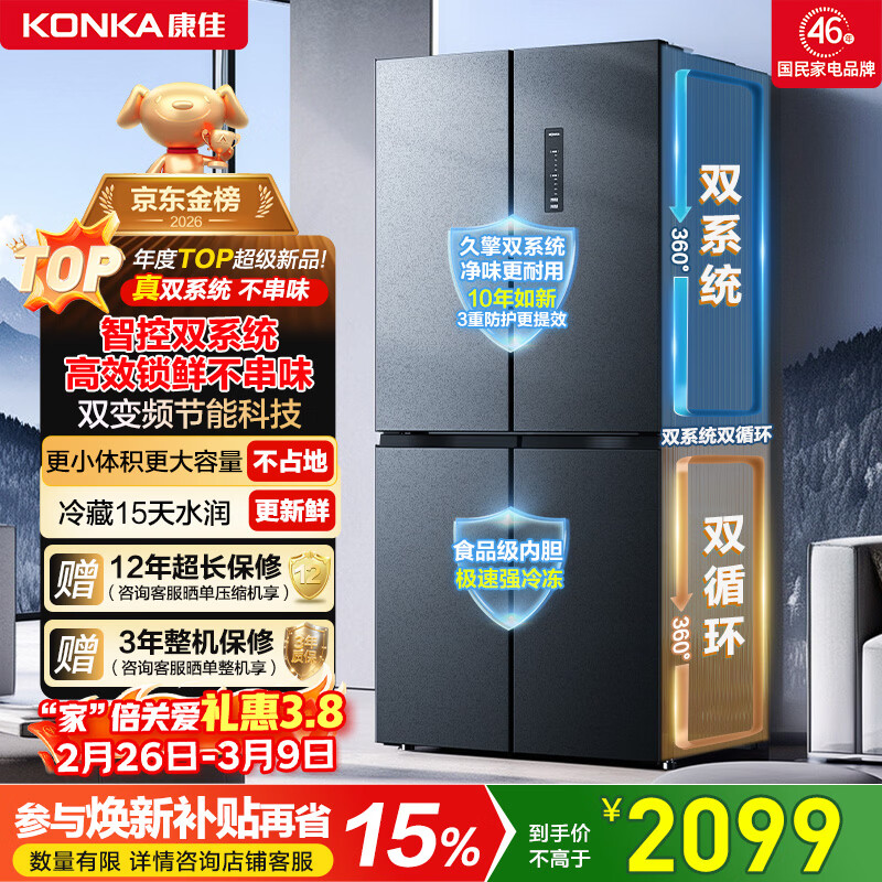 康佳(KONKA)500升十字门冰箱机皇大柚子双系统净味双循环大容量变温一级能效风冷AR-550WPDEG4国家补贴