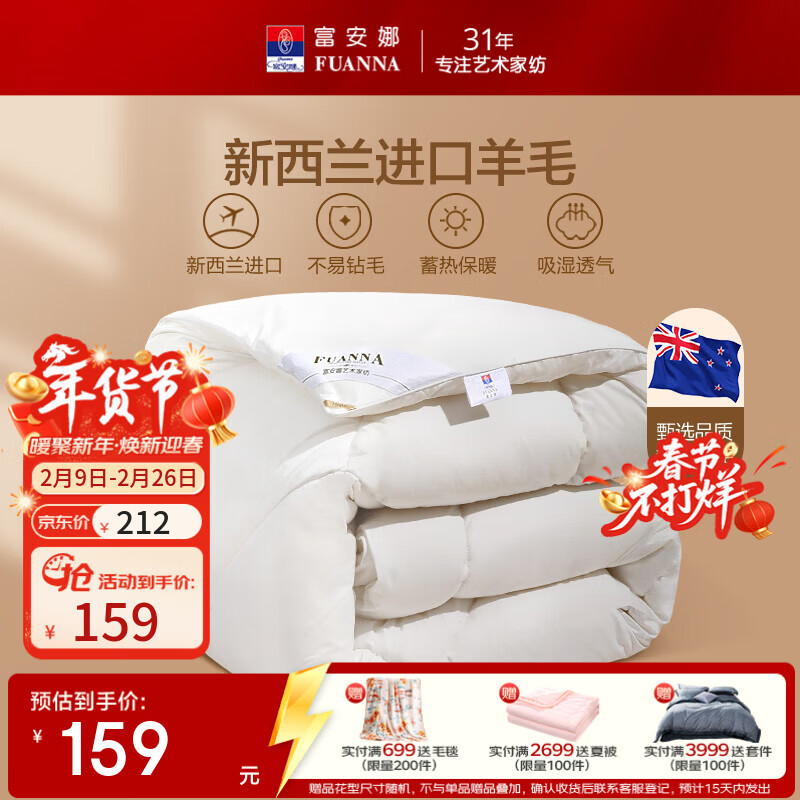 富安娜(FUANNA) 羊毛被芯冬季加厚双人抗菌保暖被子 冬厚被【进口新西兰羊毛抗菌】 1.2米床/单人(被芯152*210cm)