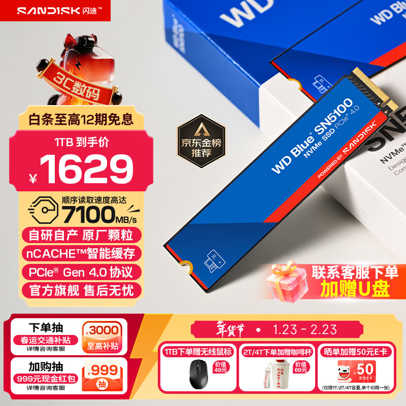 ÉÁµÏ£¨SanDisk£©ssd¹Ì̬ӲÅÌ NVMe M.2½Ó¿Ú AĮʽ»ú´æ´¢ ±Ê¼Ç±¾Éý¼¶Ó²ÅÌ Ô³§¿ÅÁ£²»Ðé±ê²»µôËÙ SN5100 | PCle4x4 7100MB/s ¡¾500G¡¿