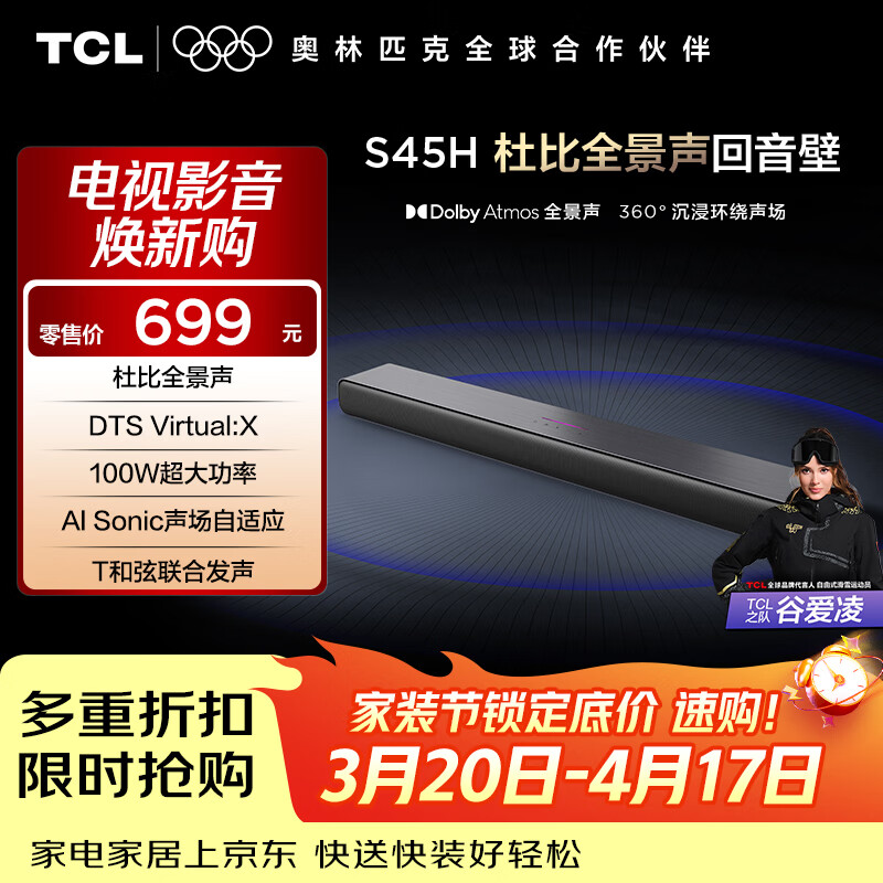TCLS45H »ØÒô±ÚÒôÏì ¶Å±ÈÈ«¾°Éù DTS Virtual:X 100W´ó¹¦ÂÊ ³¤ÌõÖÇÄܼÒÍ¥Ó°ÔºµçÊÓ¼ÒÓÃÀ¶ÑÀÖÇÄÜÒôÏä
