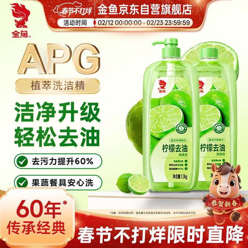 金鱼柠檬洗洁精 可洗奶瓶果蔬A类洗洁剂洗涤灵洗碗液去油1.3kg*2瓶