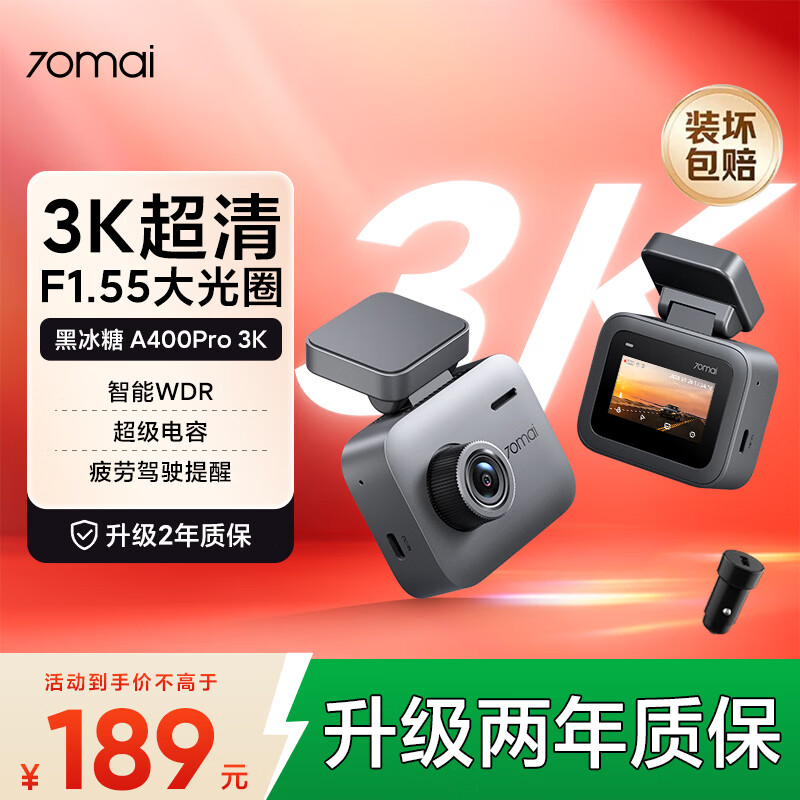 70迈 70MAI黑冰糖A400Pro 3K行车记录仪超高清夜视 无卡+车充