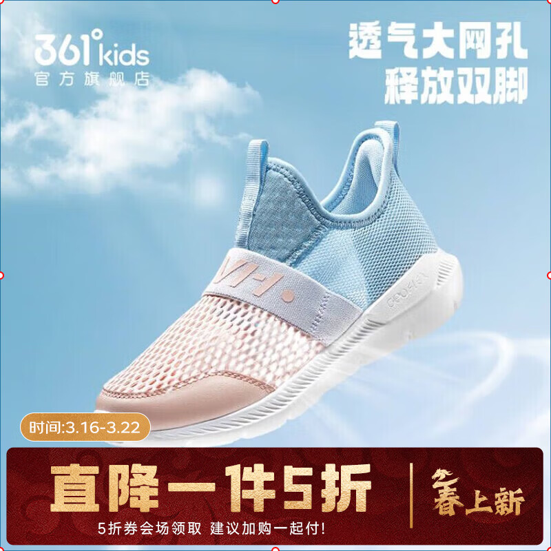 361°儿童运动鞋男女童跑步鞋夏季新款大网孔透气中大小童一脚蹬鞋子 黛粉色/水清蓝色/361度白 35码