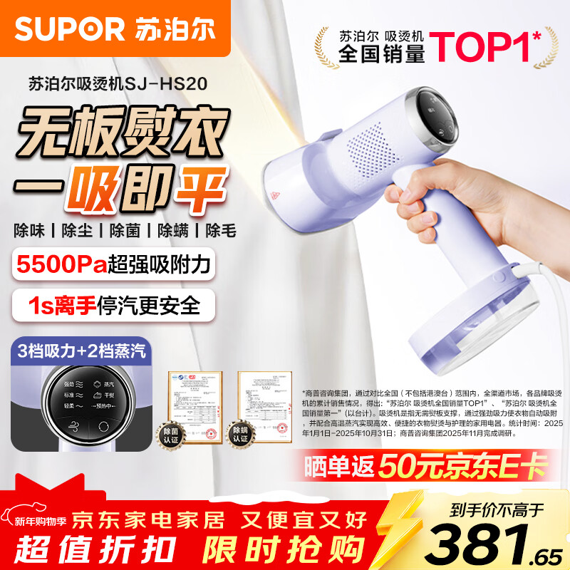 苏泊尔(SUPOR)【新一代吸烫机】吸附式手持挂烫机家用微增压大蒸汽熨烫机大功率除菌电熨斗SJ-HS20