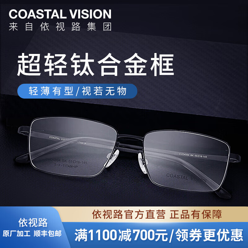 依视路爱赞全晰非球面超薄镜片数码智能防蓝光高清光学可配度数近视眼镜 钛+金属-全框-4004BK-黑色 钻晶膜御1.60现片