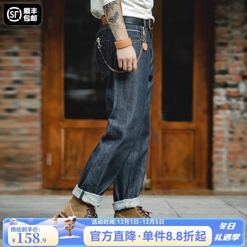 马登工装美式复古赤耳丹宁原牛男士牛仔裤重磅直筒原浆休闲长裤子男秋 牛仔深蓝 31