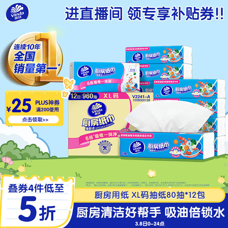 维达(Vinda)厨房纸巾【孙颖莎推荐】80抽*12包 吸油吸水懒人抹布厨房抽纸整箱