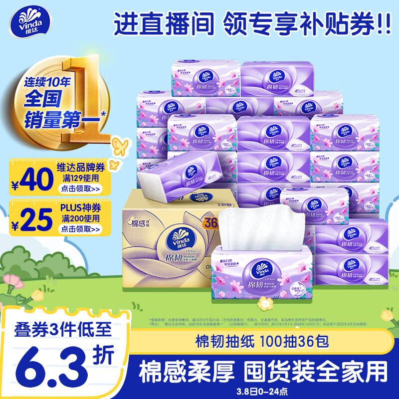 维达(Vinda)抽纸【孙颖莎推荐】棉韧3层100抽*36包S码 亲肤无刺激纸巾 AB混发