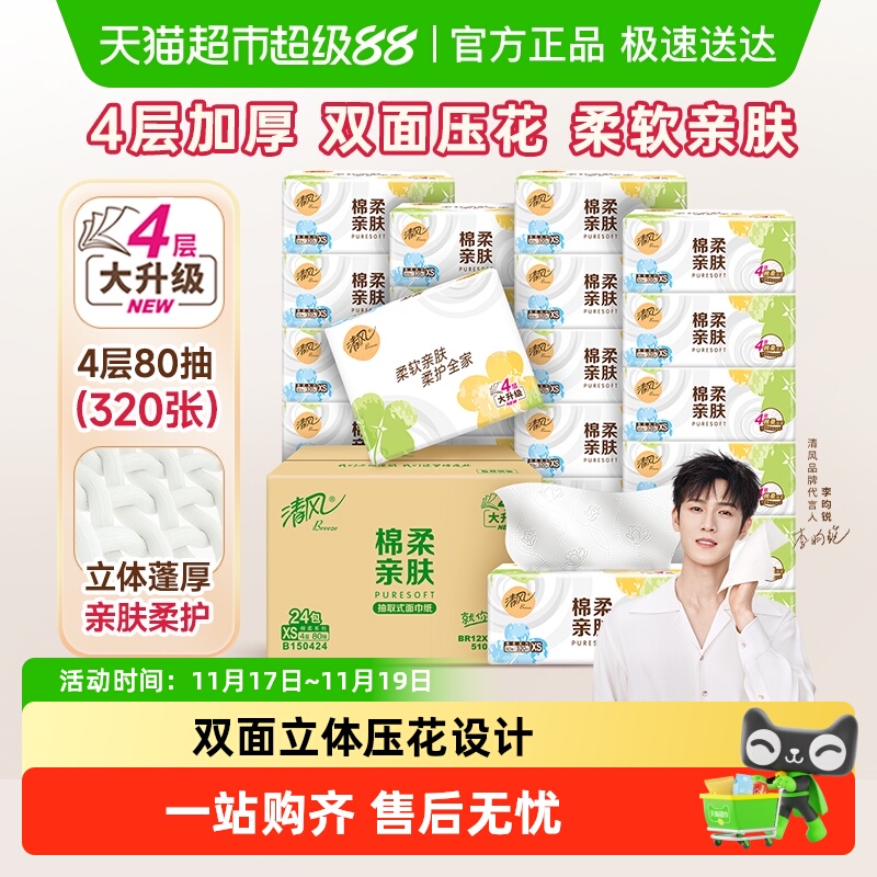 【下拉享优惠】清风抽纸原木就你4层24包餐巾面巾纸整箱实惠装
