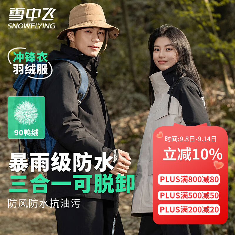 雪中飞三合一冲锋衣羽绒服女情侣款冬季运动轻户外连帽拼接保暖羽绒外套 几何黑(5915F) XL (180)