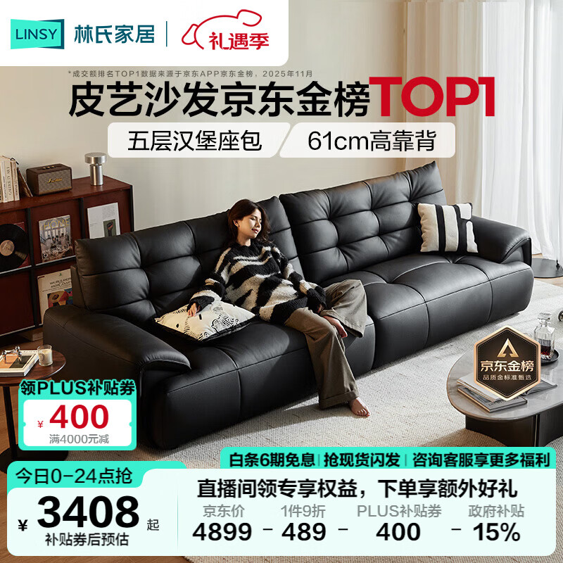 林氏家居大黑熊头层牛皮沙发客厅2025新款中古风黑色真皮意式沙发PS720