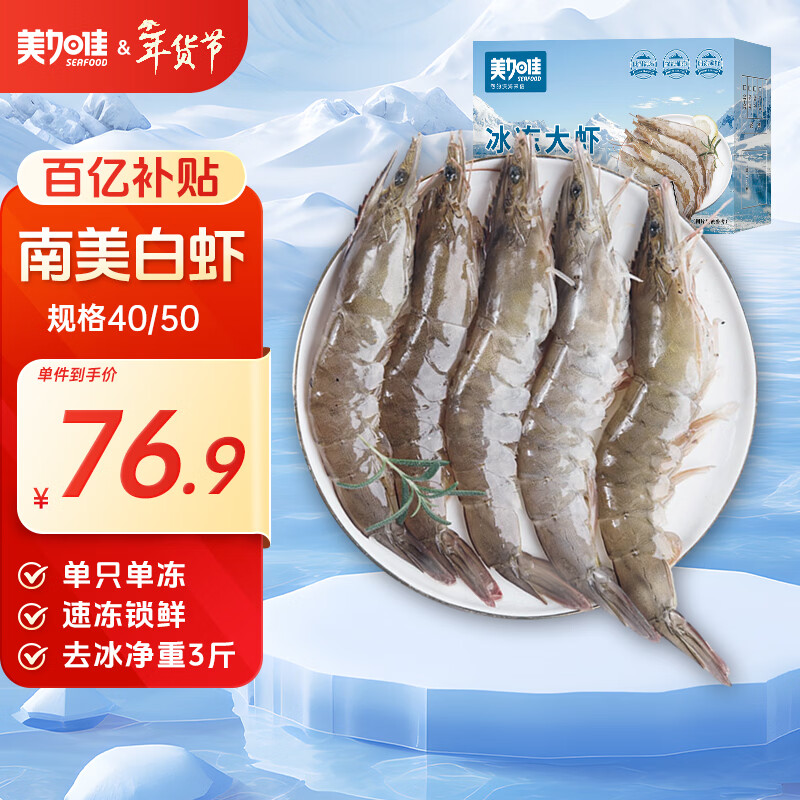 美加佳南美白虾无冰净重3斤 规格40/50 单冻大虾 年货送礼聚餐
