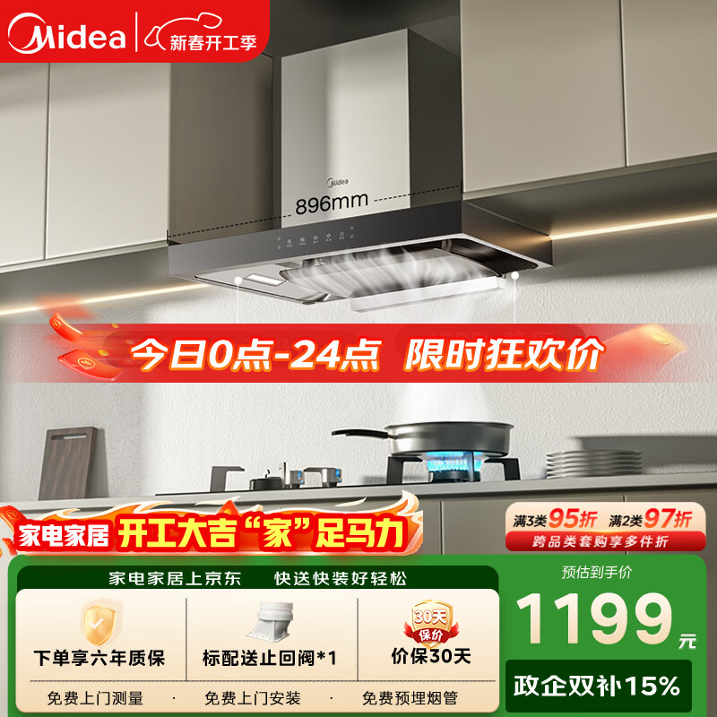 美的(Midea)抽吸排油烟机家用顶吸欧式吸油烟机22立方大吸力油烟机 挥手智控 抽烟机T36可配燃气灶