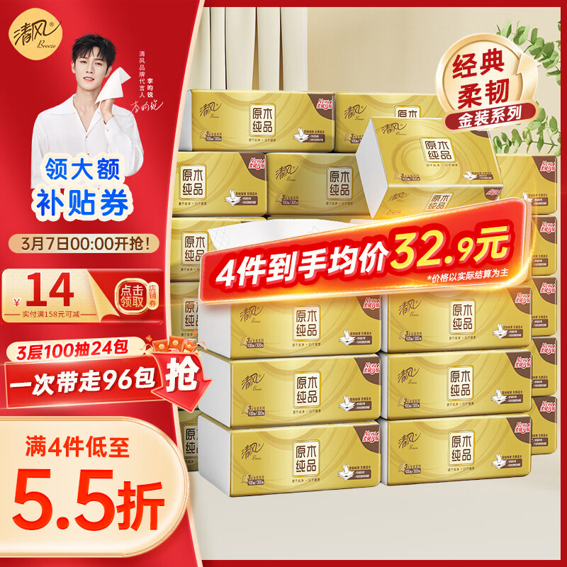 清风抽纸纸巾3层100抽24包金装面巾纸卫生纸亲肤柔韧整箱批发 3层 100抽*24包