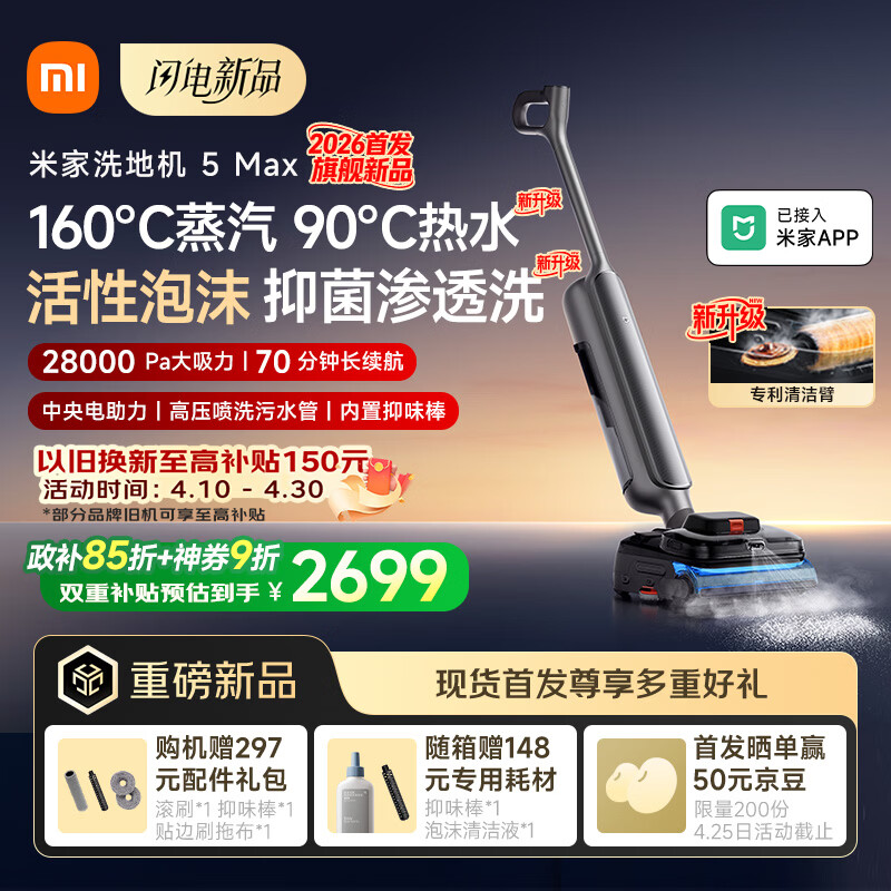 米家【新品现货开售】小米洗地机5 Max 蒸汽泡沫热水多合一 全链路自清洁 28kPa大吸力 家用洗拖吸一体