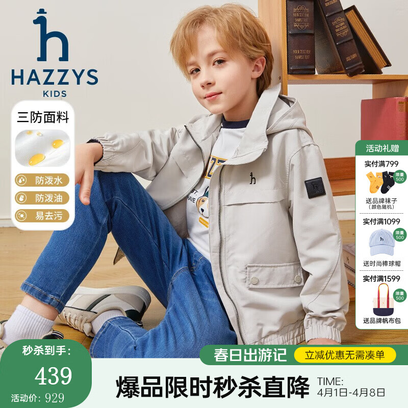 哈吉斯(HAZZYS)品牌童装男童外套秋新品三防舒适防风松紧束口帅气夹克 极地灰 165