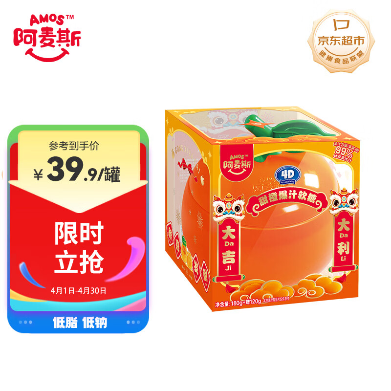 阿麦斯(amos)4D甜橙爆汁软糖300g/盒 大桔大利QQ糖 橡皮糖 儿童糖果 年糖礼盒