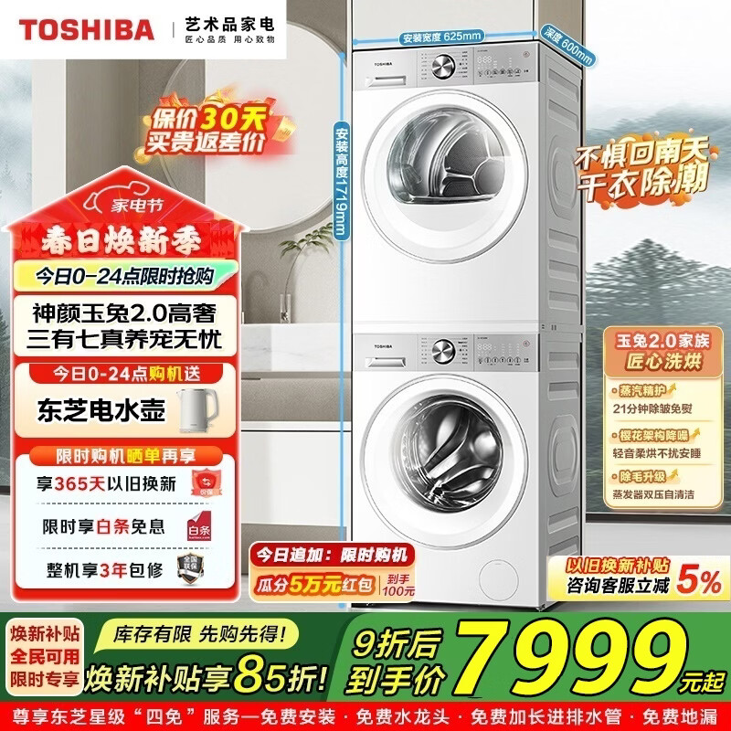 东芝(TOSHIBA)玉兔2.0高奢洗烘套装10KG大容量 全自动滚筒洗衣机+变频热泵烘干机 A级除味除皱 AI智能投放 DG-10T183BW+DH-10T183BW