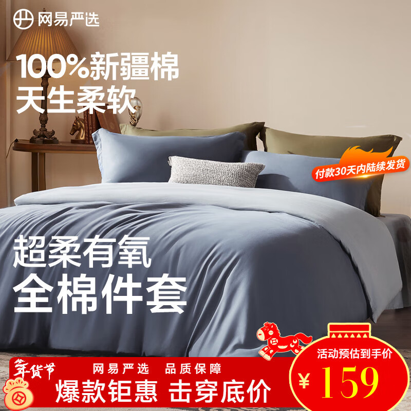 网易严选【100%新疆棉】有氧纯棉四件套A类枕套床上用品床被套罩床单宿舍 【全棉奢享升级】远山黛 【三件套】 床单款 (被套1.5*2m)
