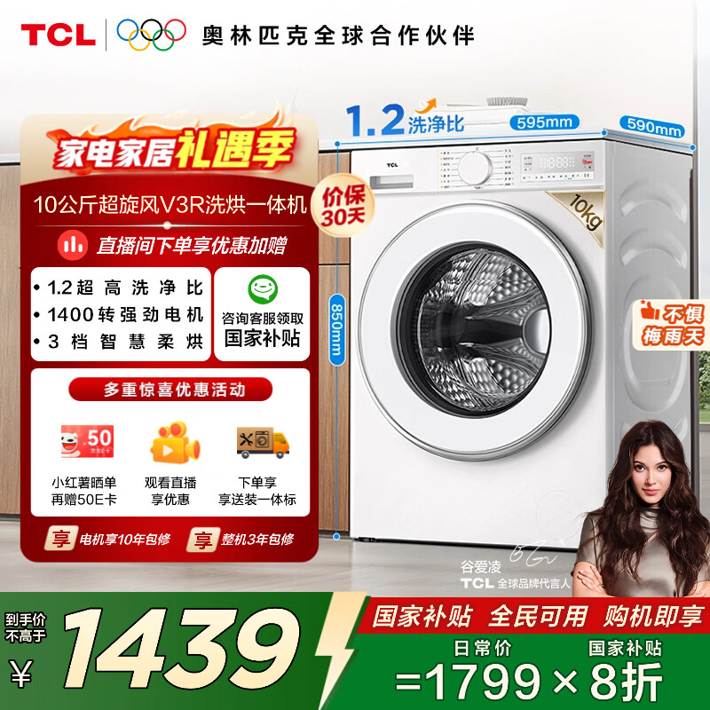 TCL超旋风10公斤变频洗烘一体滚筒洗衣机全自动家用1400转1.2洗净比家电国家补贴以旧换新G100V3R-HB