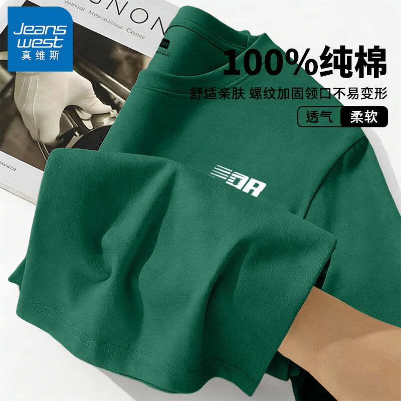 真维斯(Jeanswest)夏季纯棉短袖t恤男透气舒适青少年圆领落肩袖基础款大码宽松T恤GW 墨绿#JZS白色时尚X 5XL