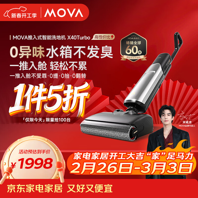 Mova【宋威龙宠粉专用】推入式洗地机X40Turbo【0异味】100℃沸水浸泡洗 180°平躺三年质保过年送长辈