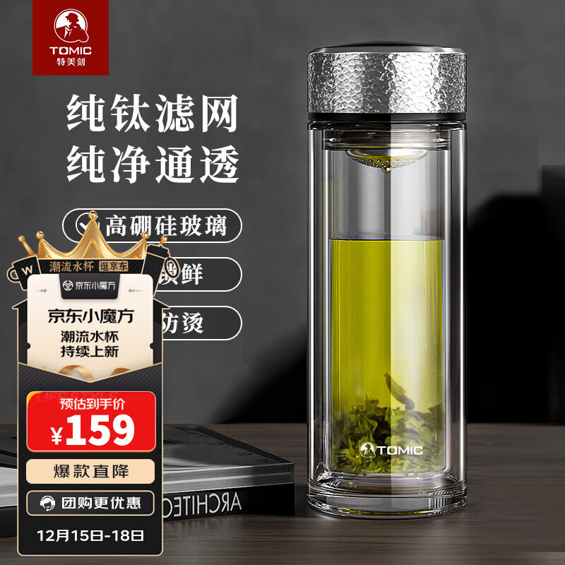 特美刻(TOMIC)男士玻璃杯双层加厚高硼硅玻璃水杯纯钛茶隔过滤家用办公泡茶杯 银本色【钛茶隔】360ml