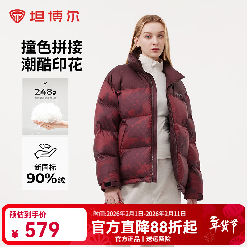 坦博尔【红色】情侣时尚潮流情侣立领拼接撞色面包服短款厚羽绒服男红色 山云红 S