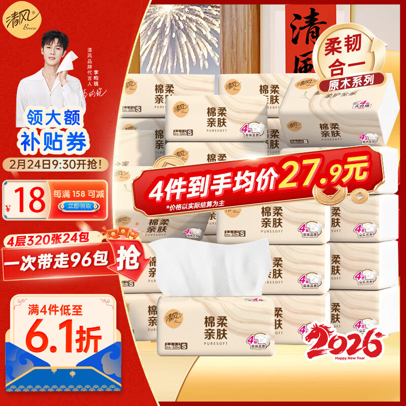 清风抽纸亲肤4层24包纸巾餐巾纸卫生纸母婴适用 整箱销售 4层 80抽*24包