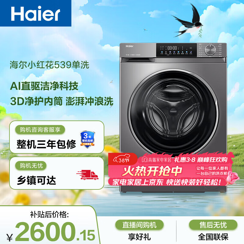 海尔(Haier)小红花 全自动滚筒洗衣机10KG 超薄直驱 冲浪洗 减震降噪 家电京东自营 XQG100-BD539S
