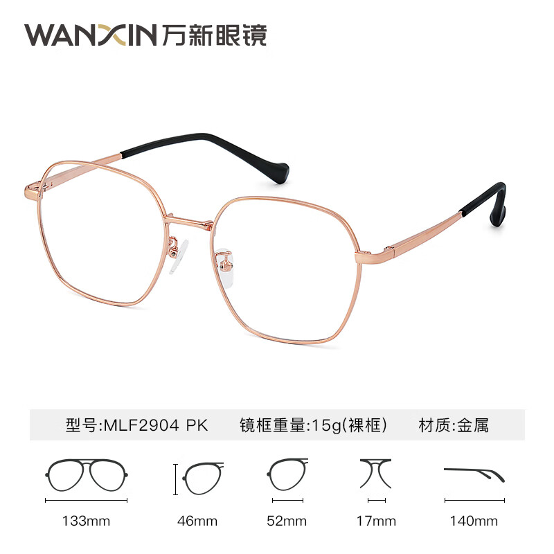 万新(WAN XIN) 万新近视眼镜配眼镜框高清非球面现片男女金属钛多种框型选择 金属-全框-2904PK-粉金色 1.67非球面镜片(近视特薄)