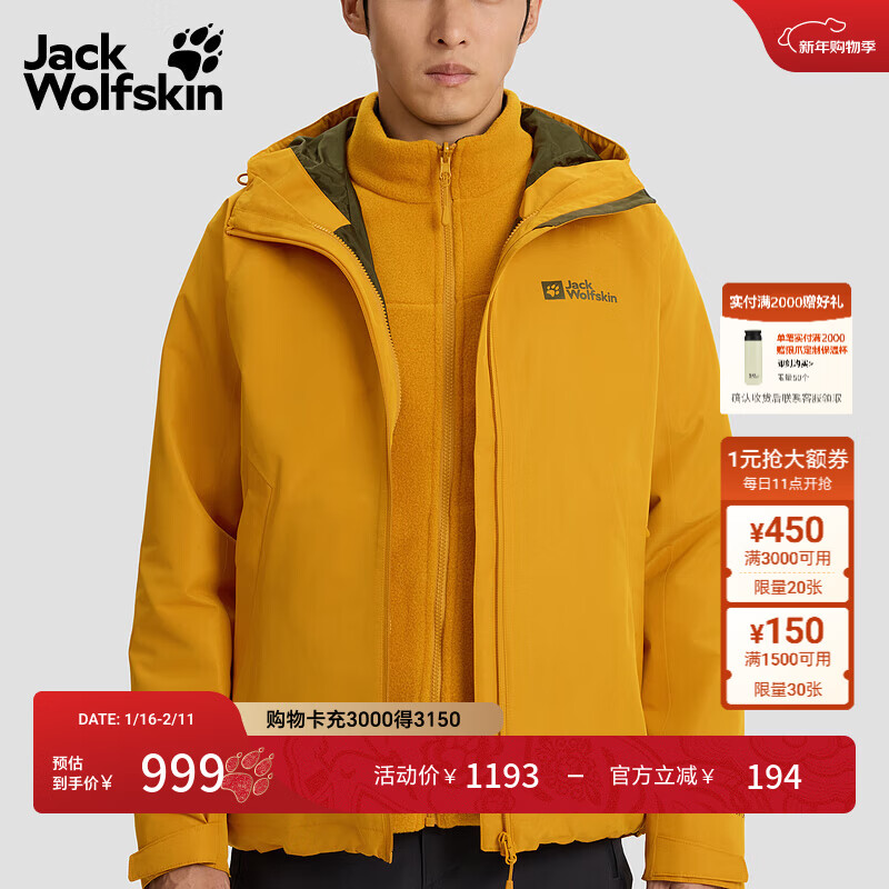 jackWolfskin狼爪25秋冬新款JOYFUL男款防水抓绒内胆三合一冲锋衣外套A65467 盏花黄/M0043 M