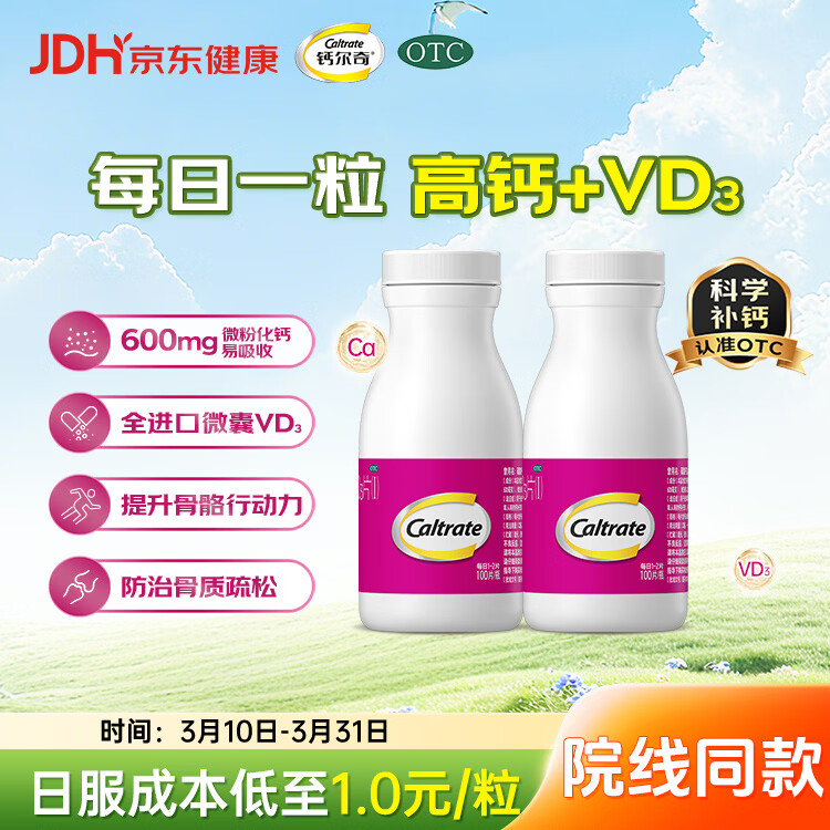 钙尔奇碳酸钙D3片(I)100片*2盒OTC钙片维生素d3成人钙孕妇哺乳补钙含补充剂老年钙手足抽筋预防骨质疏松