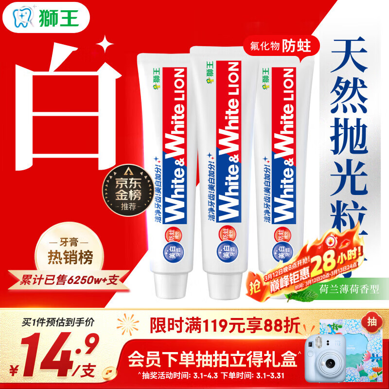 狮王(Lion)Whitewhite进口美白牙膏荷兰薄荷150g×3大白管去黄去牙渍