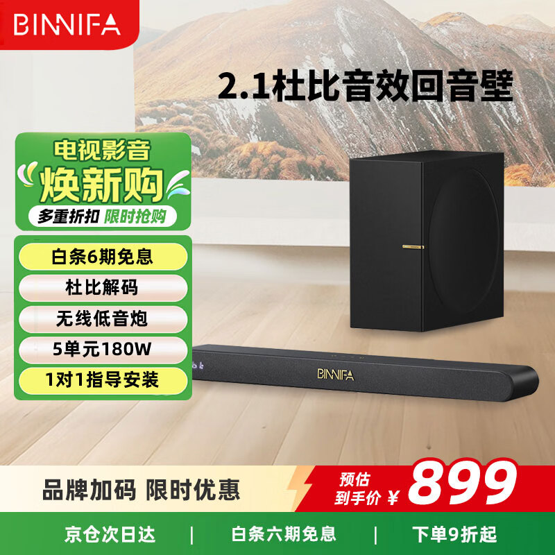 BINNIFA杜比音效解码重低音大功率独立低音炮家庭影院回音壁电视音响音箱全木质发声DSP数字音效