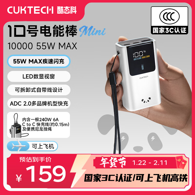 CUKTECH酷态科【3C认证可上飞机】10号超级电能棒mini充电宝55W快充自带线电芯10000毫安时适用苹果17小米