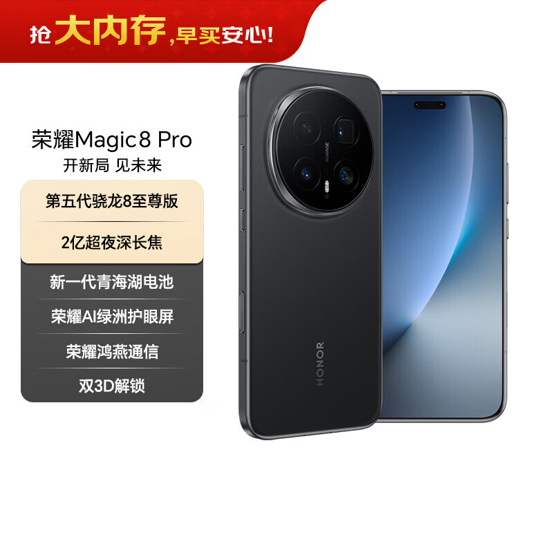荣耀Magic8 Pro 16+1TB 绒黑色 第五代骁龙8至尊版 2亿超夜神长焦 双3D解锁 谢霆锋同款 5G AI手机