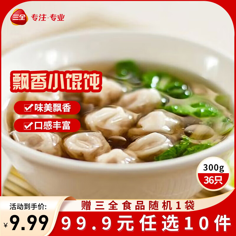 三全黄金比例水饺含馅量≥60%可煎炸蒸煮饺子方便家庭早餐晚餐速 三鲜飘香小馄饨300g