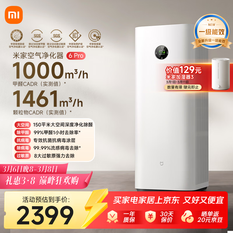 米家小米【发布会同款】空气净化器 6 Pro 新升级双芯架构大空间 除菌除醛母婴级家用除甲醛净化器